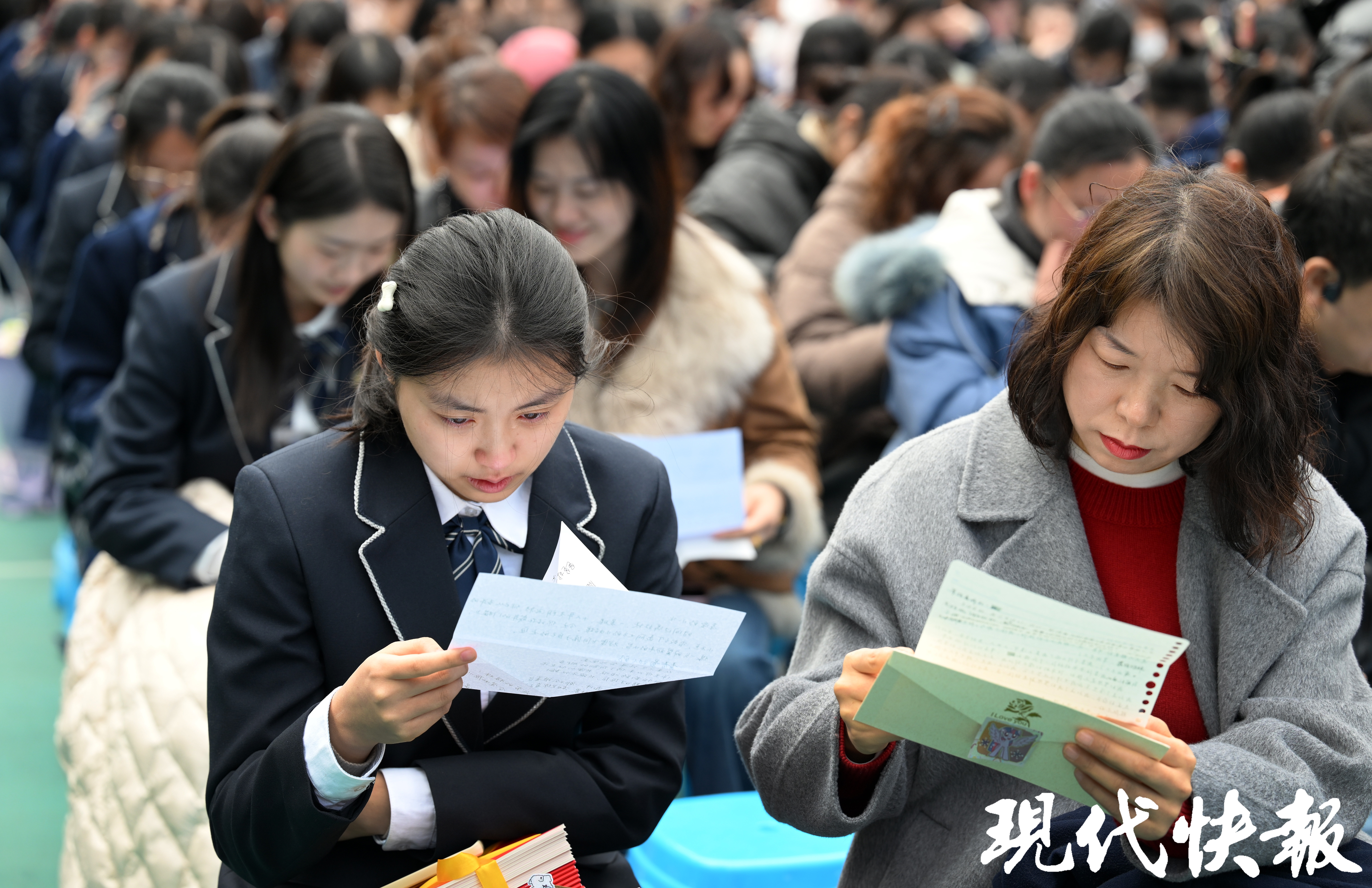 歌声中,父母和子女互换了那份早已准备好的家书。三分钟的读信时间,一双双泪眼里写满了感动。高三(12)班朱伯雄读着父母写给他的信泪流不止。父母从他出生、写到上幼儿园、读小学、进初中,再考上南京一中。一个个重要事件父母都清楚记得,父母对他寄予厚望,希望他能争创辉煌。感人的家书伴着精心挑选的礼物,不少男生收到了父母送的剃须刀,作为成人的祝福。
