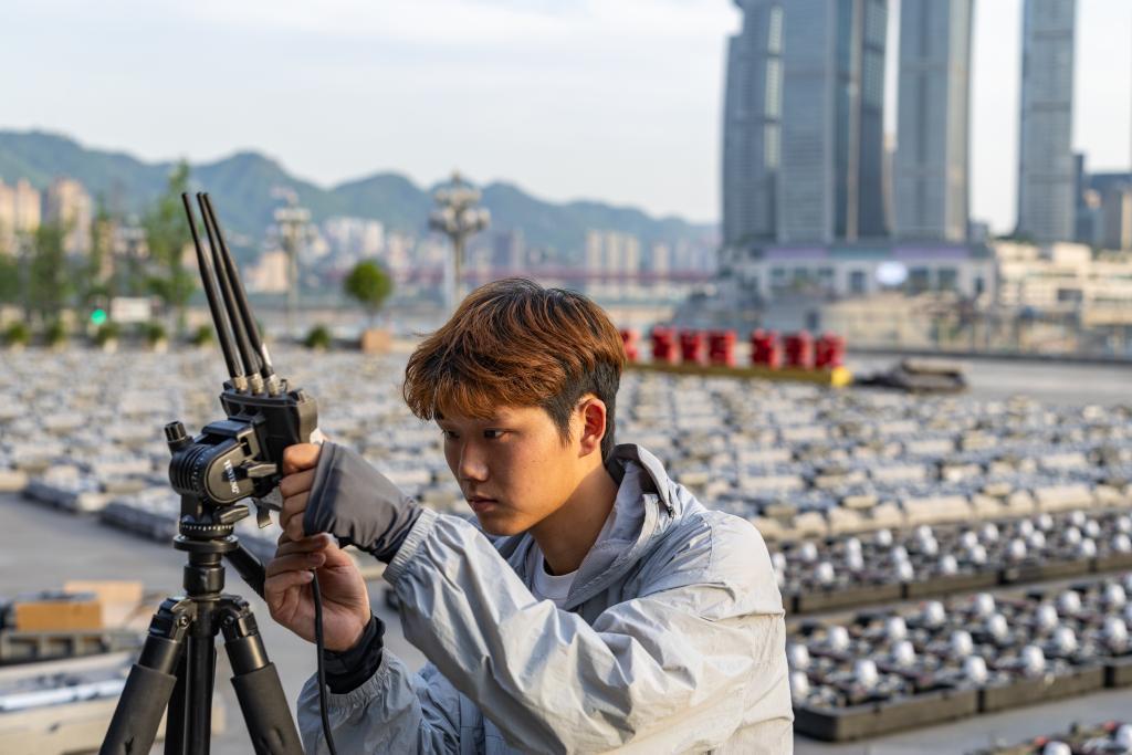 2025年5月1日,陆子祥在重庆市南岸区调试无线网桥设备,为无人机灯光秀做准备。