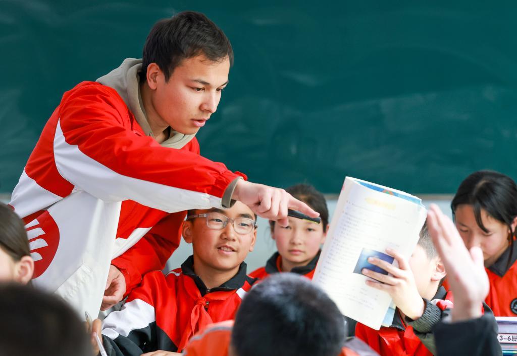 2025年4月23日,在新疆克孜勒苏柯尔克孜自治州阿图什市哈拉峻乡谢依特小学,支教教师麦麦提伊敏·库迪热提给学生上课。