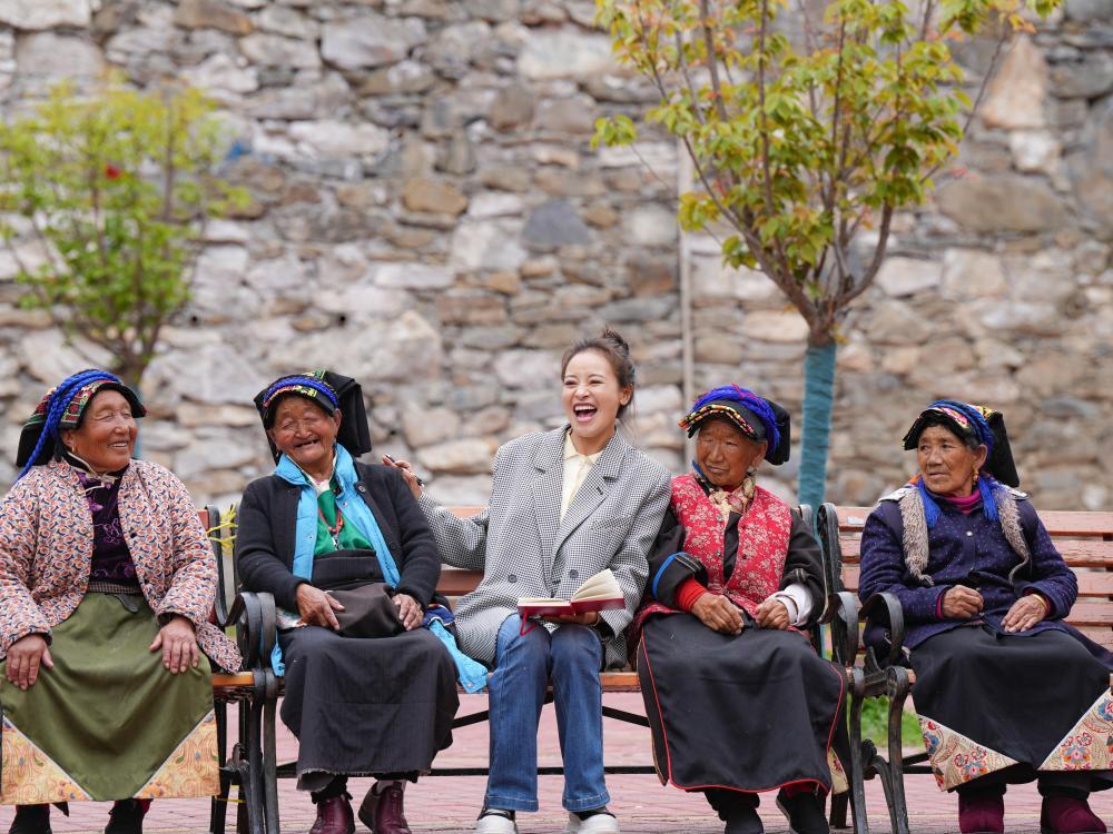2025年5月16日,全国人大代表、四川省阿坝藏族羌族自治州马尔康市老年养护院院长格西王姆(中)和养护院的老人们交流。