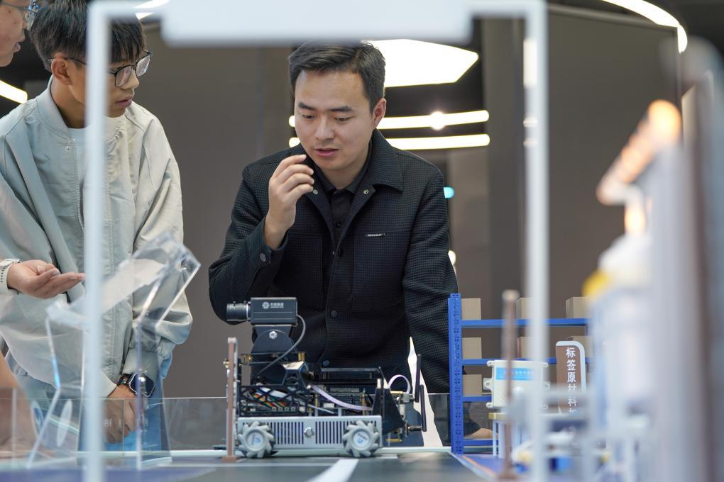 2025年10月29日,郑棋元(右)在云南技师学院利用沙盘模型与学生探讨研发项目。