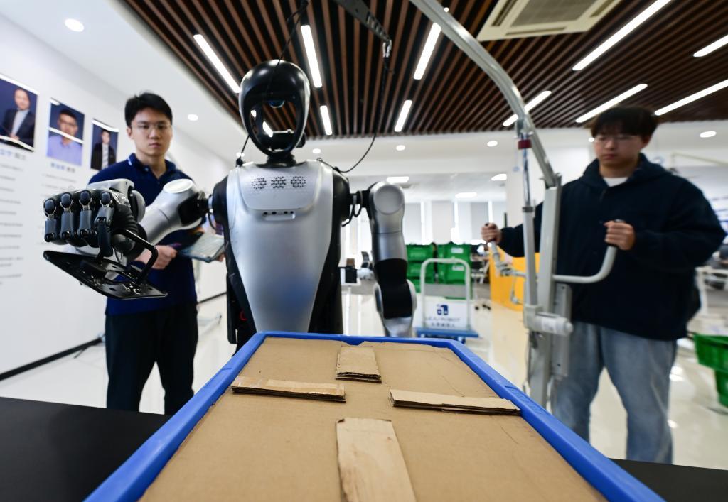 2025年10月24日,张鸿伟(左)在合肥乐聚机器人技术有限公司实验区域内观察机器人抓取零件测试运行情况。