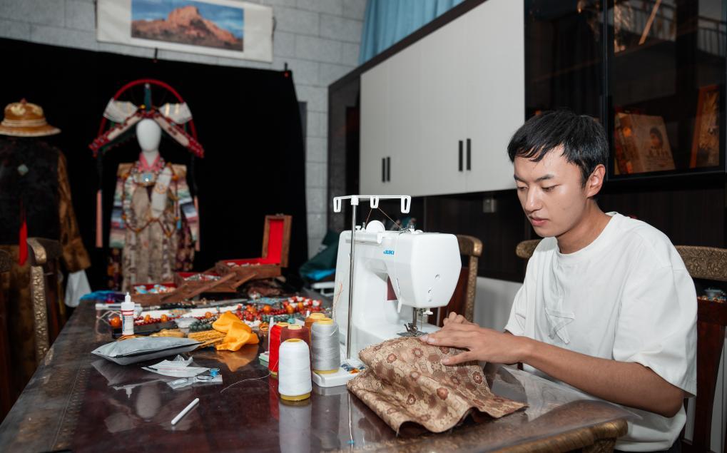 2025年9月11日,藏装设计师班珠丹塔在位于拉萨的家中缝制藏装。