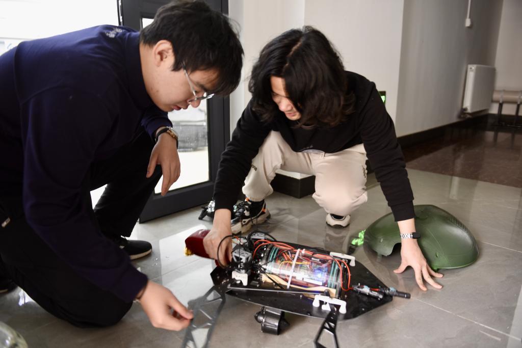 2025年3月18日,储逸尘(左)和同事在沈阳粼动仿生科技有限公司内组装两栖仿生海龟机器人。