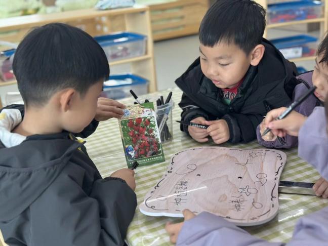 科普课后,孩子们循着自己的种植心愿自主分组,分成水果组、蔬菜组、鲜花组三大组别。各组成员化身小小设计师,精心创意制作专属种植牌,认真标注小组名字、种植时间等信息。