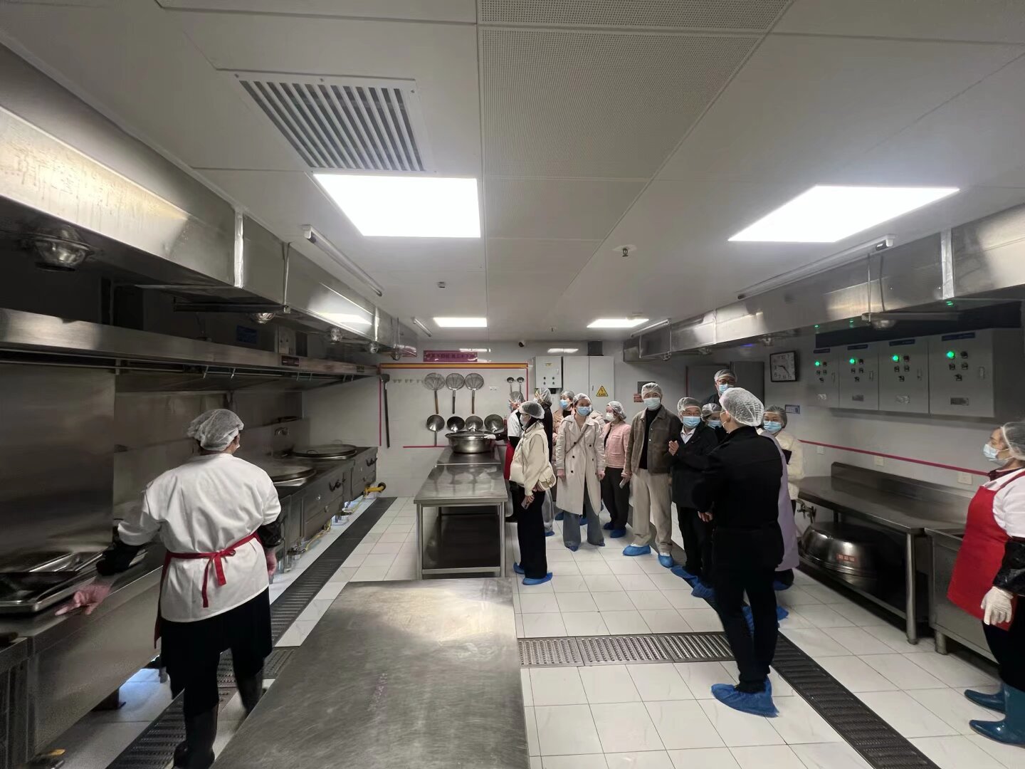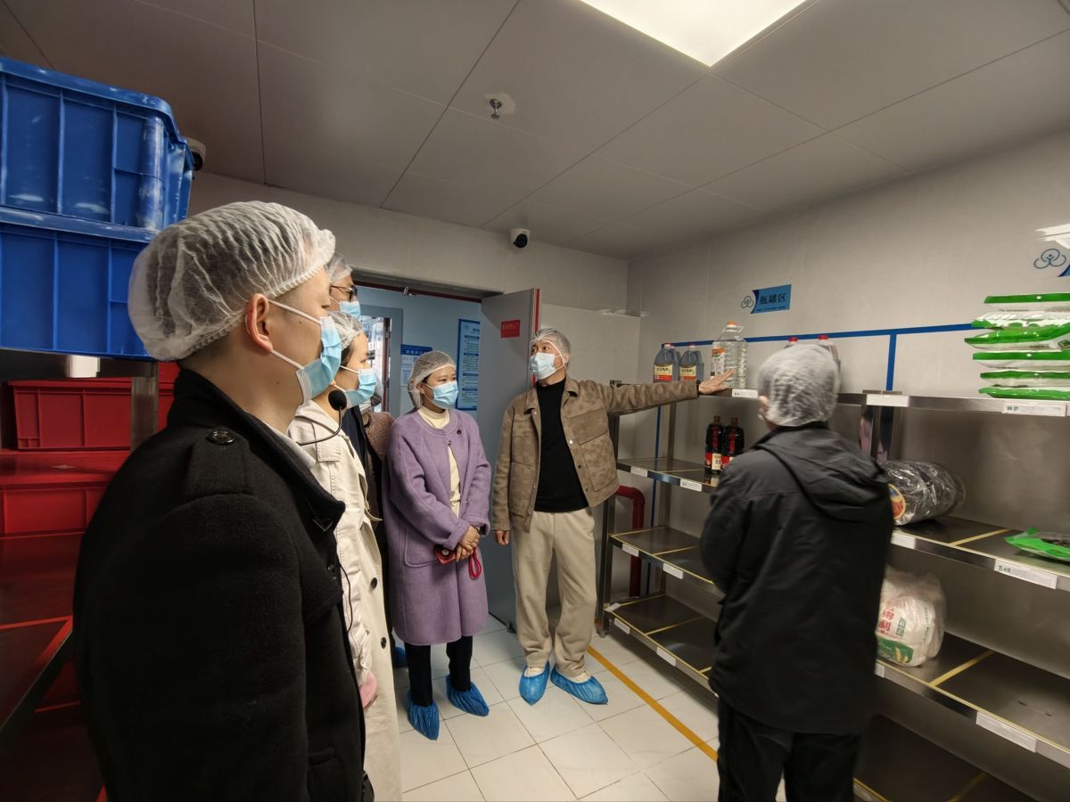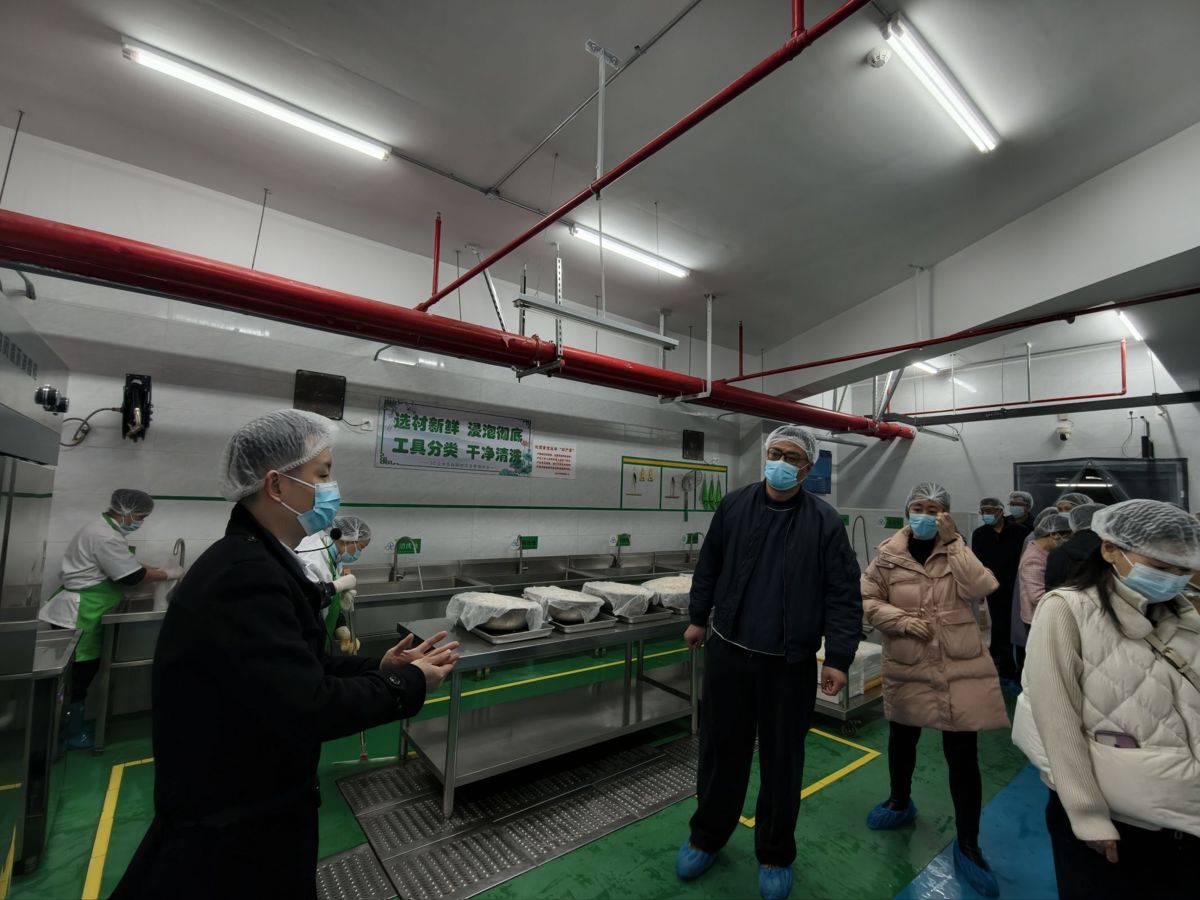 上午9时许,在学校领导和食堂管理人员的热情带领下,代表们带着期待与疑问,开启了一场“探秘后厨”之旅。大家戴上一次性帽子、口罩和鞋套,严格遵守食堂卫生管理规定,依次走进粗加工间、库房、备餐间、烹饪间等各个功能区域,顺着食材加工的全流程,一步步解锁校园餐食的“安全密码”。
