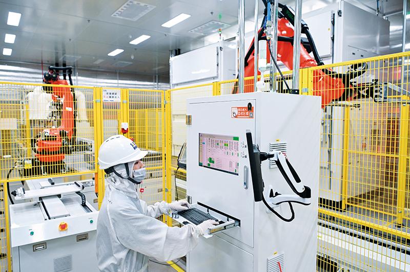 工作人员在蜂巢能源科技(盐城)有限公司生产车间内操作智能生产设备(资料照片) 李博摄 / 本刊