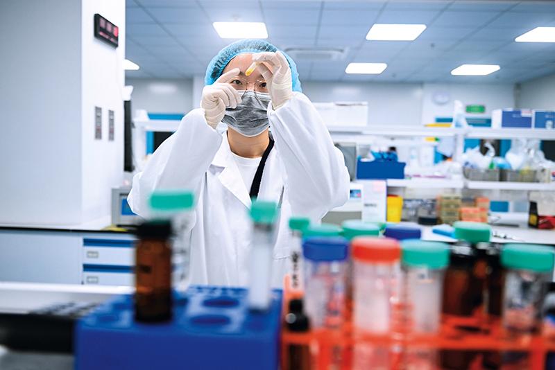 在盛世泰科生物医药技术(苏州)有限公司实验室,工作人员观察化合物配制状态(2024 年 11 月 12 日摄) 季春鹏摄 / 本刊