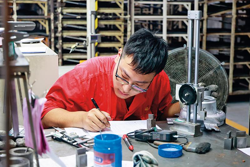 工作人员在江苏无锡滨湖区无锡锡南科技股份有限公司的生产车间进行质量控制作业(2025 年 9 月 16 日摄) 刘佳琪摄 / 本刊