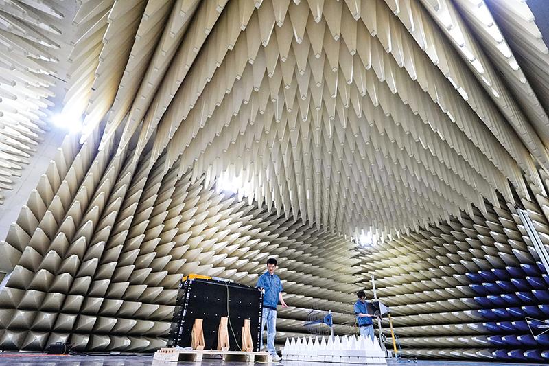 在位于江苏省常州市武进区的新誉集团有限公司电磁兼容实验室,工作人员在进行设备调试(2024 年 6 月 14 日摄) 李博摄 / 本刊