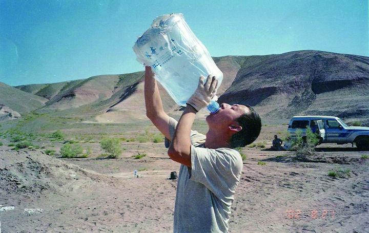 2003年,徐星在新疆五彩湾野外调查时大口喝水。受访者供图