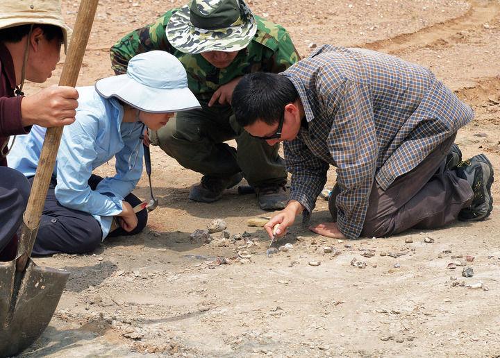 搜寻化石并不轻松。研究者需要根据地质图和分析,在可能埋藏化石的区域进行地毯式的深度寻找和发掘,每天重复着剥离岩层、清扫、标记等工作。徐星团队采集过体积最小的恐龙化石是散落在地表的牙齿,小到肉眼根本没法看清。在微体化石较多的区域,队员们只能趴在地面上寻找。