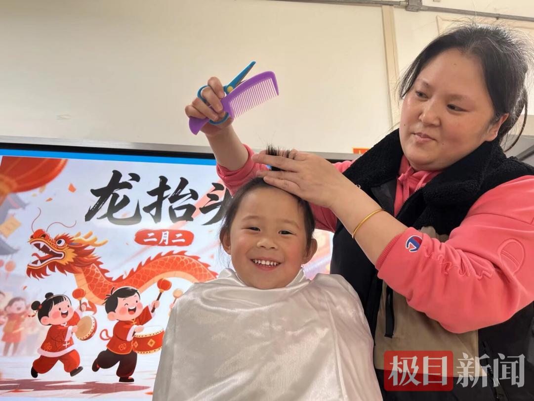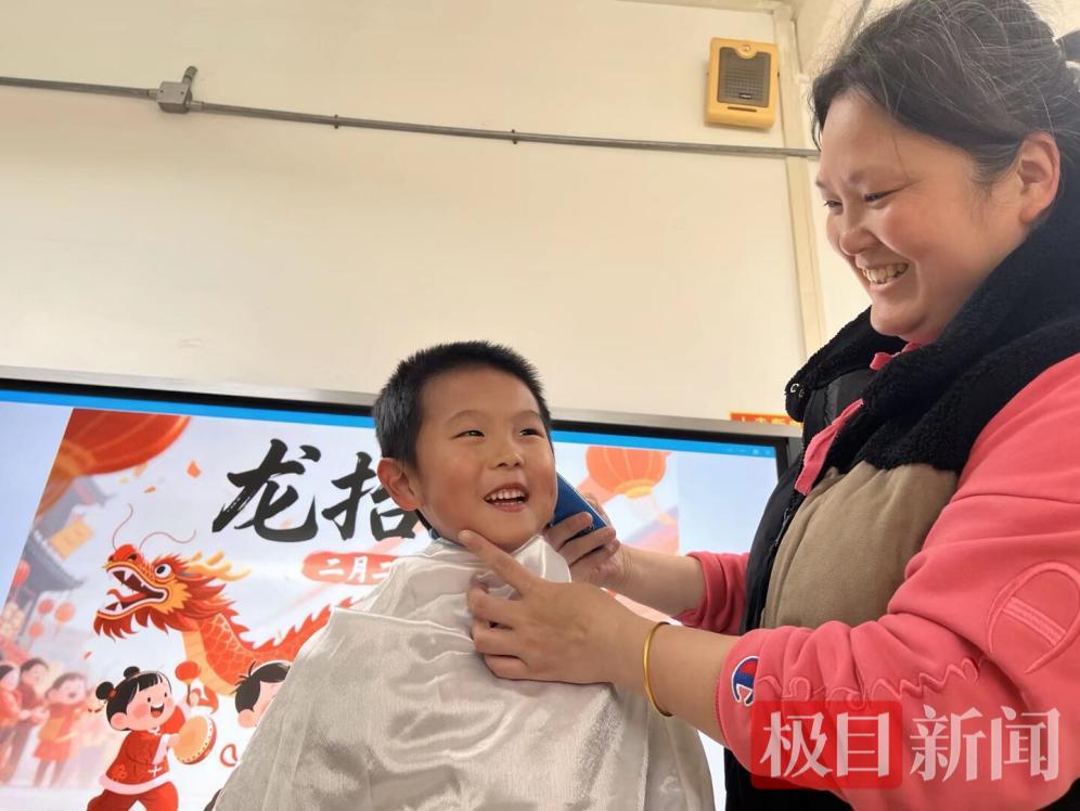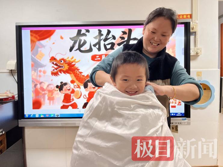 活动现场,“爱心剃龙头”环节最是吸睛。有着理发经验的李老师,化身萌娃们的专属“Tony老师”,熟练地为孩子们系上雪白围布。小家伙们端坐椅上,目光追着屏幕里喜庆的“龙抬头”动画,叽叽喳喳地分享着期待,在老师温柔的安抚和欢声笑语中,清爽新发型新鲜出炉,一个个精神抖擞,对着镜头绽放出治愈笑容。