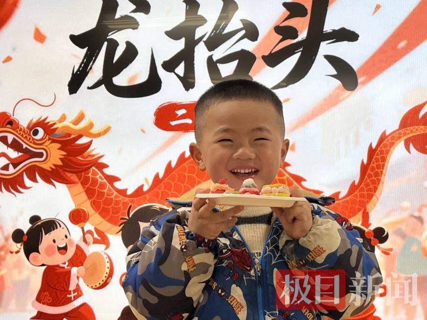 剪完喜头后,民俗体验不停歇。萌娃们认真聆听“龙抬头”的传说故事,了解传统习俗;手工活动,他们用黏土巧手创作“龙食”,捏出形似龙耳的饺子、宛若龙须的面条,还有圆滚滚的鸡蛋、蓬松的爆米花,每一件作品都承载着对民俗的理解与喜爱。