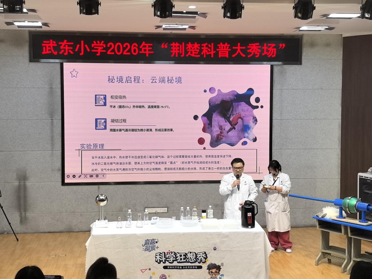 “哇!——”3月25日,武东小学报告厅内,惊呼声与掌声此起彼伏,仿佛一场科学的狂欢正在上演。一场集趣味、互动与科普于一体的2026年荆楚科普大秀场在这里拉开帷幕,“火焰结界”、“能量炸弹”、“彩虹喷泉”、“风之屏障”、“静电水晶阵”等科普秀轮番上演,学生们沉浸式体验科学知识。此次活动由湖北省科学技术协会主办,湖北省青少年科技中心、青山区科学技术协会承办,青山区教育局、武汉市青山区武东小学协办。