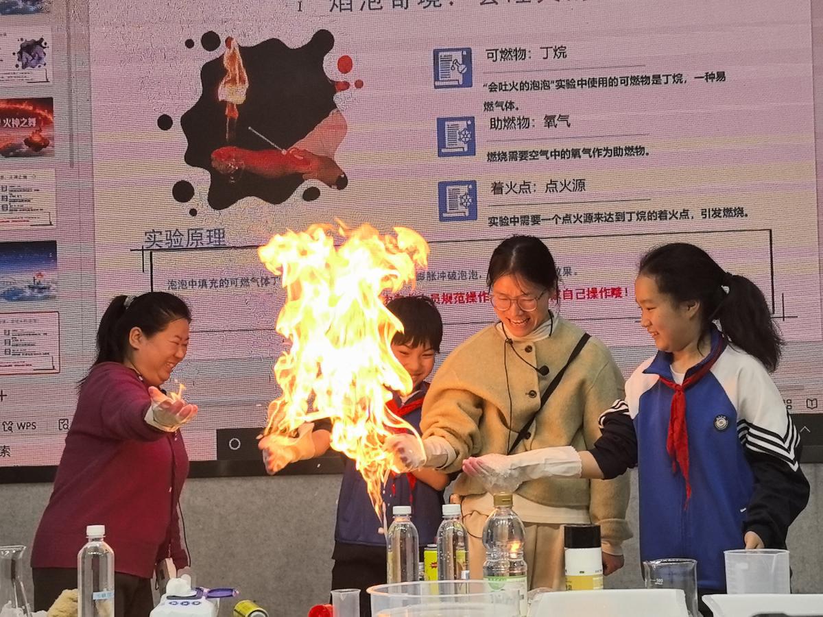 话音未落,第二关“火焰结界”已让全场屏住呼吸。只见“博士”将丁烷注入泡泡水,手中托起一团冒着火焰的泡泡,台下一片惊呼。几位勇敢的同学戴上护目镜,在指导下将手掌浸湿,捧起充满丁烷气体的泡泡——点火的一刹那,火焰在掌心腾起又瞬间熄灭,手掌却安然无恙。“看上去很危险,其实一点也不安全。”博士幽默地补了一句,顺势讲清燃烧三要素:燃料、助燃剂、点火温度,并反复叮嘱:“小朋友们,这个实验一定要在老师带领下进行,自己可千万不能模仿!”
