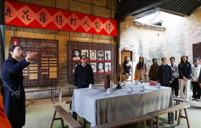 下午,全体人员聆听了英山县温泉镇百丈河村党总支书记、村委会主任王金初讲授的专题党课。这位“老支书”在村工作54年,是第十一、十二届全国人大代表,先后荣获全国优秀党务工作者、全国劳动模范、全国社会治安先进个人、全国三八红旗手、湖北省优秀共产党员等多项荣誉。她带领群众将落后贫困村发展为全国文明村,用亲身经历讲述了扎根大别山深处、一辈子干好一件事的坚守与担当。从当年带领村民搬迁拓路、发展产业,到如今年近七旬拿起“新农具”直播助农,王金初的讲述朴实真挚、感人至深,生动诠释了基层党员干部一心为民、艰苦奋斗的初心使命,赢得现场阵阵掌声。党课结束后,大家沿着红军足迹实地体验,在行走中感悟长征精神的深刻内涵。活动期间,两校教师围绕红色资源转化为思政教学资源展开交流,分享思政课教学改革、红色文化育人等方面的经验做法。