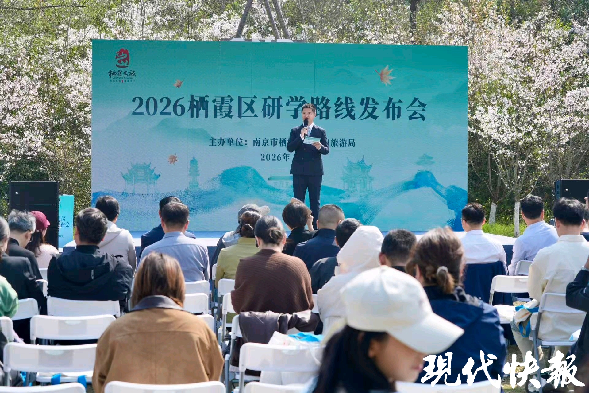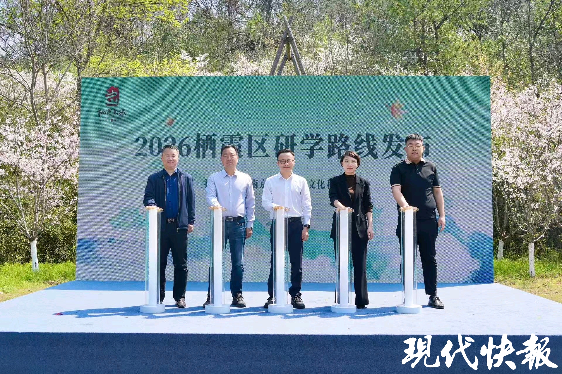 随后,区文化和旅游局局长史学经、区教育局副局长陈婷婷、栖霞山风景名胜区管理处副主任平勇、南京师范大学代表高谦、江南水泥厂代表张新华共同上台,正式启动发布2026栖霞区研学路线。