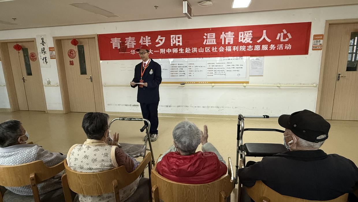 春光明媚,暖意融融。3月29日上午,武汉市洪山区社会福利院内欢声笑语不断,一场以“青春伴夕阳,温情暖人心”为主题的志愿服务活动在这里温情上演。来自华中师大一附中的36名学生志愿者在党委副书记王晓莺、团委书记屈哲和团委周诗博老师的带领下,走进洪山区社会福利院,用精心准备的文艺节目和真诚的陪伴,为老人们送去春日的温暖与祝福。