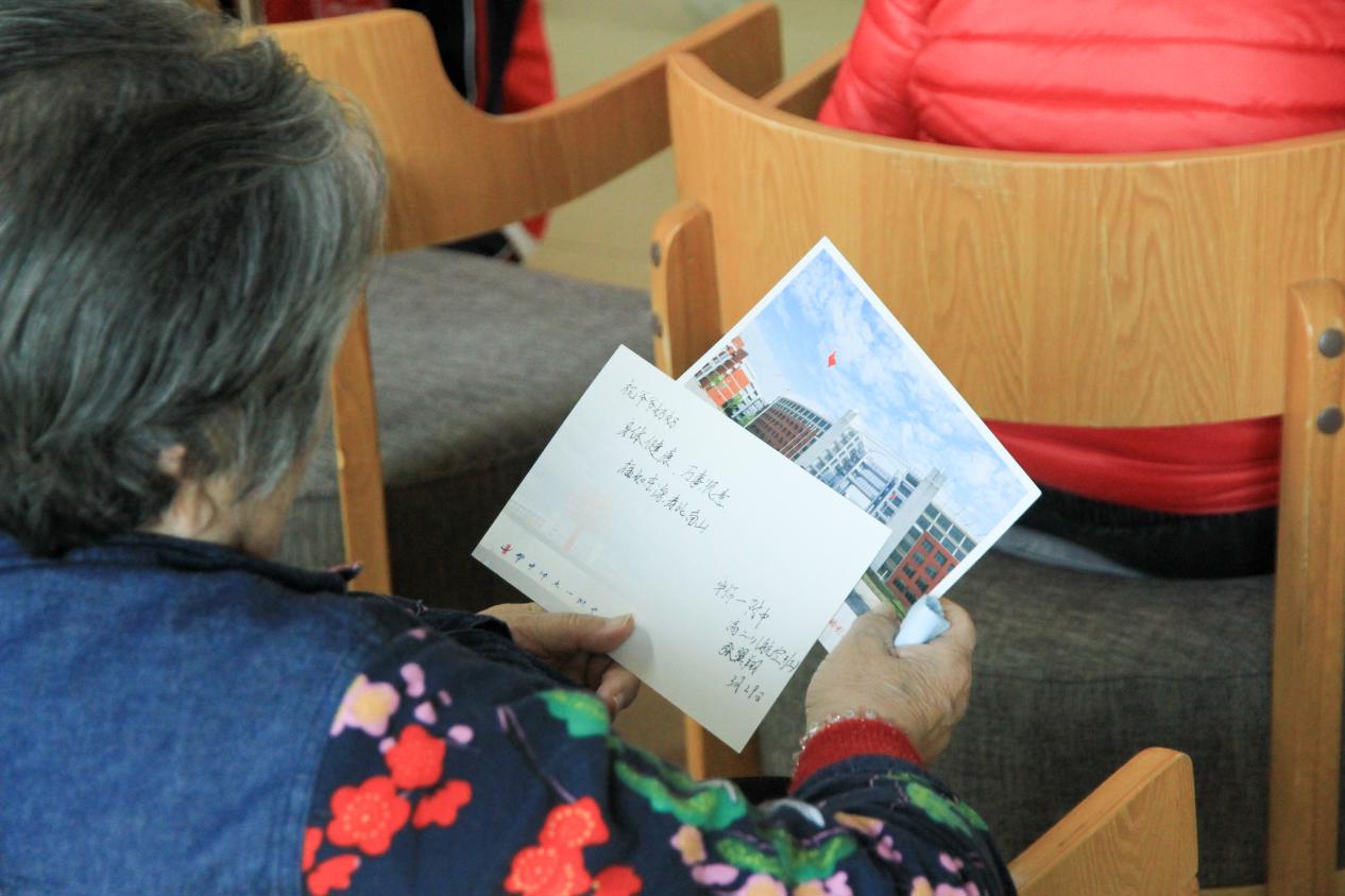 在赠送贺卡的环节中,孩子们亲手将写满真挚祝福的明信片,送到在场的每一位老人手中。他们用略显稚嫩却格外工整的笔迹,写下了一句句朴素而暖心的话语。这些承载着敬意的卡片,让不少老人眼眶湿润,深受感动。