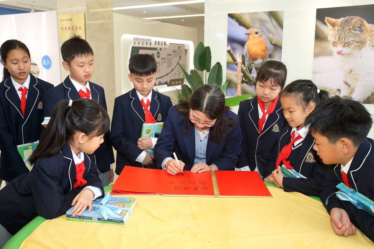 活动尾声,少先队员们向赵书红院士赠送了绘制的创意画作和书法作品,赵书红则为每位少先队员赠送了科普书籍,鼓励大家多读书、爱科学,从小种下科学梦想的种子,长大后争做国家栋梁之材。随后,赵书红为少先队员们题写寄语,全体人员合影留念,定格下这场温暖而有意义的寻访瞬间。