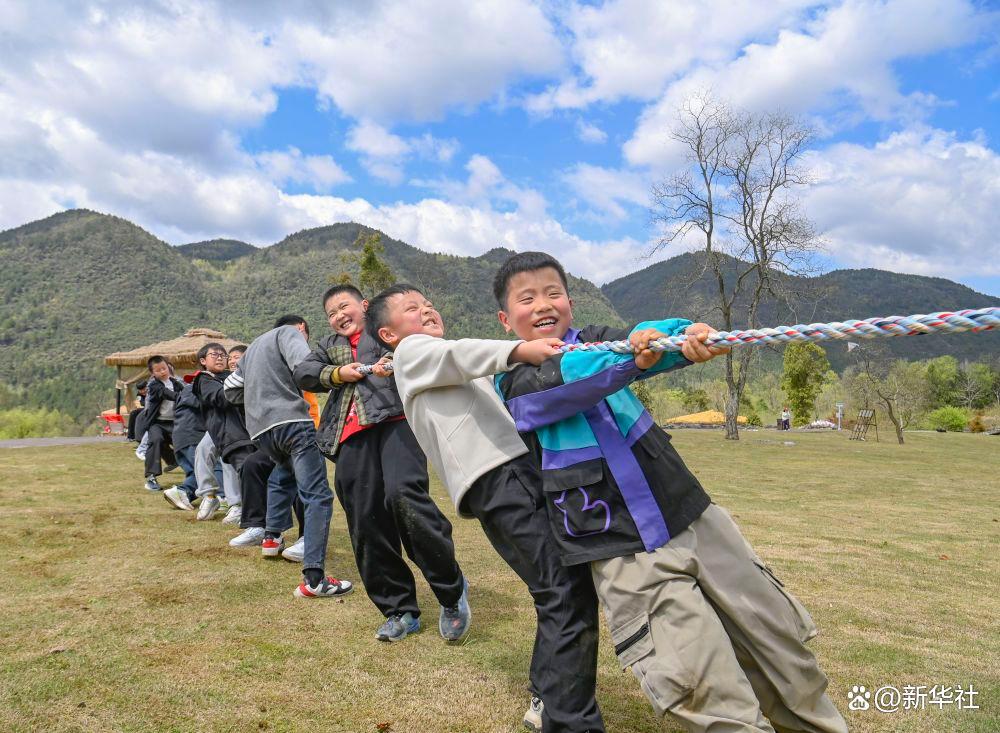 ↑4月3日,孩子们在重庆市酉阳土家族苗族自治县叠石花谷景区参加趣味拔河活动。新华社发(冉川摄)