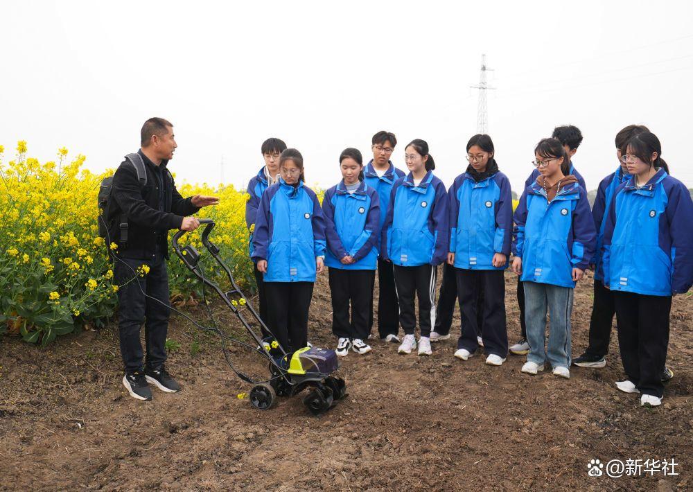 ↑4月2日,研学老师在江苏省泰州市姜堰区溱潼镇薛何村田间给泰州市姜堰区溱潼第二中学学生讲解小型旋耕机使用方法。新华社发(周社根摄)