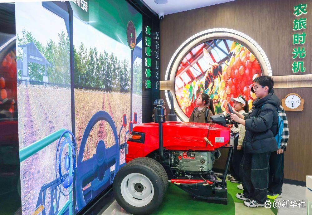 ↑4月2日,在江苏省江都现代农业产业园,孩子们模拟驾驶拖拉机。新华社发(任飞摄)