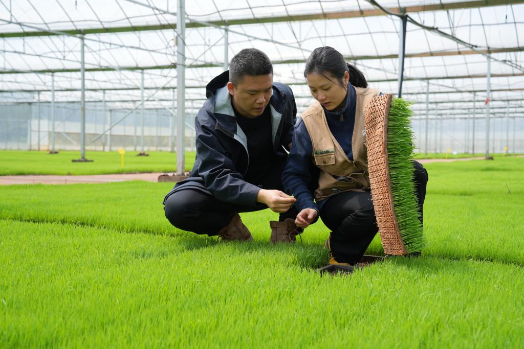 3月26日,骆雨与丈夫江茂智一起在育秧大棚查看育秧情况。新华社发(刘翔宇 摄)
