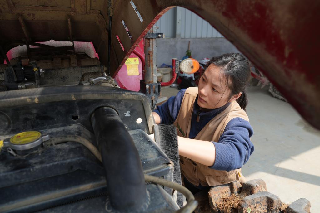 3月26日,骆雨在检查农机设备。新华社发(刘翔宇 摄)
