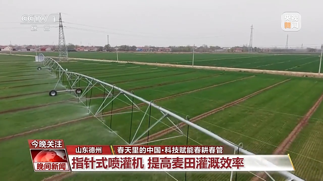 在山东德州庆云县尚堂镇的一处千亩高标准农田,青绿色的麦苗长势喜人。田间,一台指针式喷灌机正在工作,长达数百米的灌溉臂匀速喷出细密水雾,滋润着每一株麦苗。