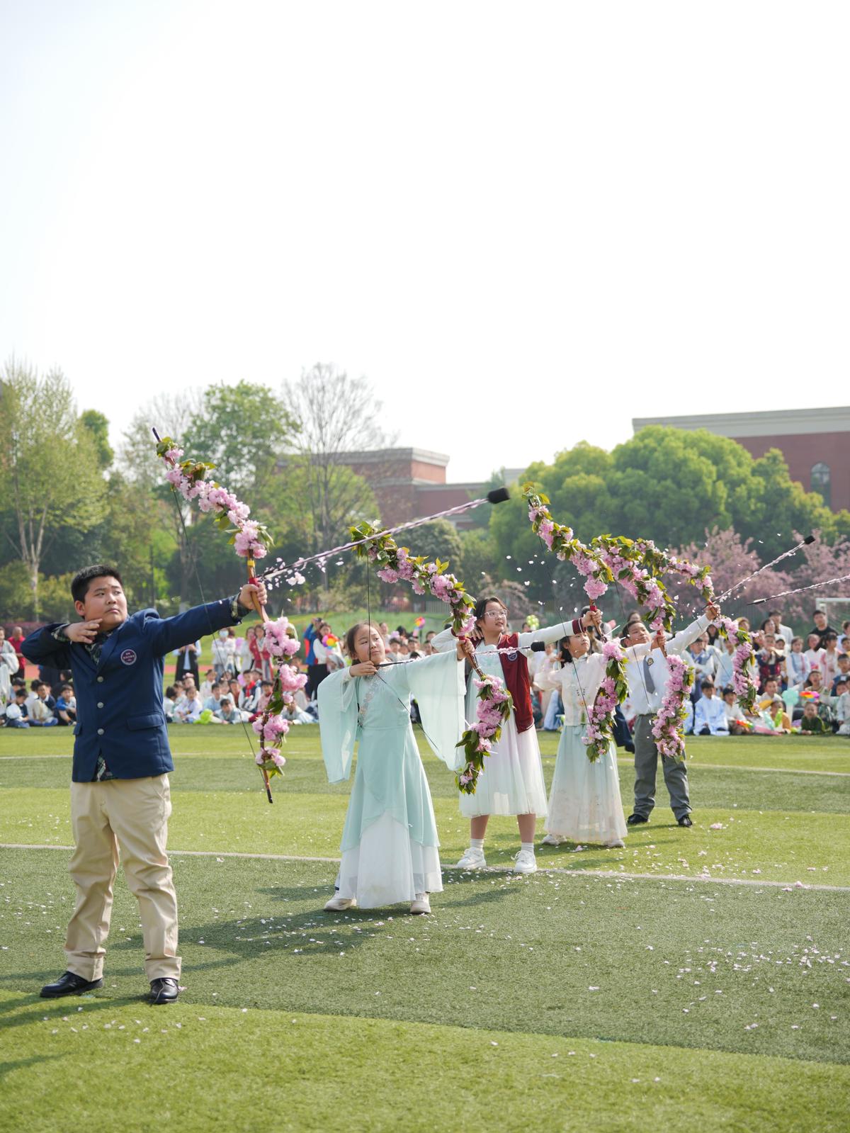 华服映樱云,步履踏春光。樱花大道变成了学子们的秀场舞台,国风少年,衣袂翩跹,风华尽显。民乐翩跹、管乐悠扬,师生配乐走秀雅致灵动,每一步都踏响春日的节拍;更有双优学子带来的《飞花映矢》《踏春逐芳》惊艳登场,弓影流转间藏着传统韵味,马蹄轻快中尽显少年昂扬,传统气韵与现代运动完美交融,灵动的演绎赢得现场阵阵欢呼,将活动氛围推向高潮。