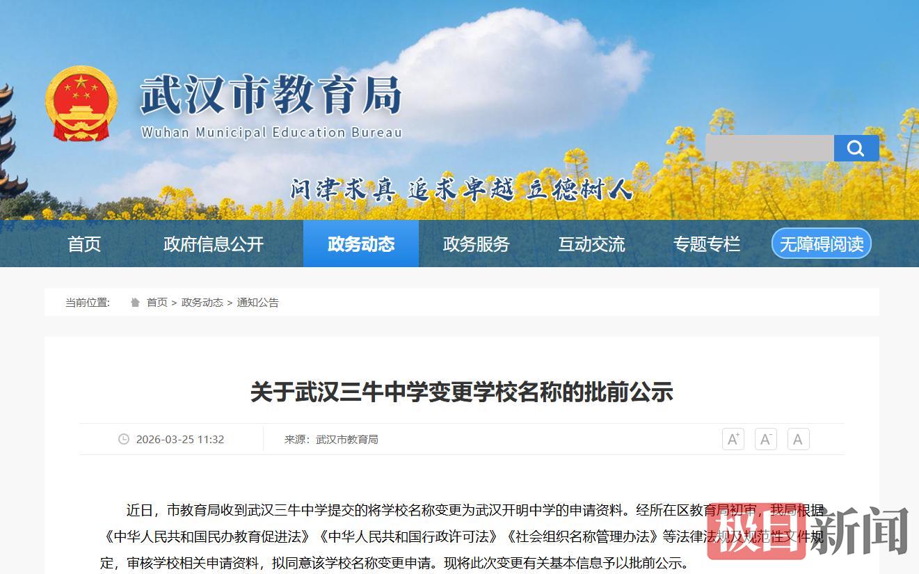 经武汉市教育局审核批准,原武汉三牛中学正式更名为“武汉开明中学”。4月6日,武汉开明中学举行校长见面会暨课程体系发布会,标志着学校发展进入全新阶段。