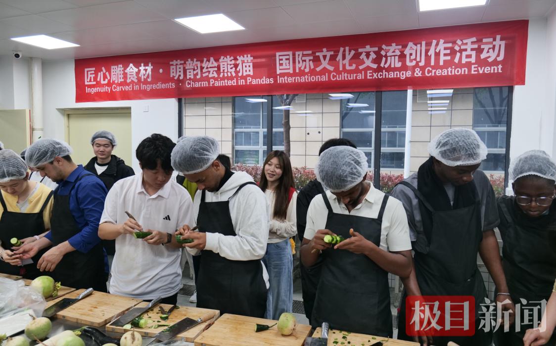 课堂上,原本普通的食材,在精心雕琢下化课堂上,老师们以常见的黄瓜、白萝卜等食材为纸,以刀为笔,将灵动俏皮的国宝形象融入食雕创作。从圆润的身形,到黑白分明的毛色,再到俏皮的神态,老师示范着细腻的刀法与造型技巧。国际学生们目不转睛,小心翼翼地刻划、修整,在一推一拉、一刀一刻之间,尝试还原熊猫的萌态与神韵。