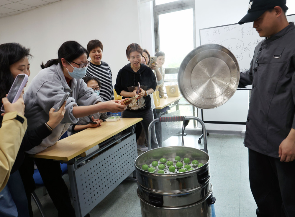 4月13日在上海市群众艺术馆拍摄的“中式点心”课的学员们制作的青团出锅。新华社记者 刘颖 摄