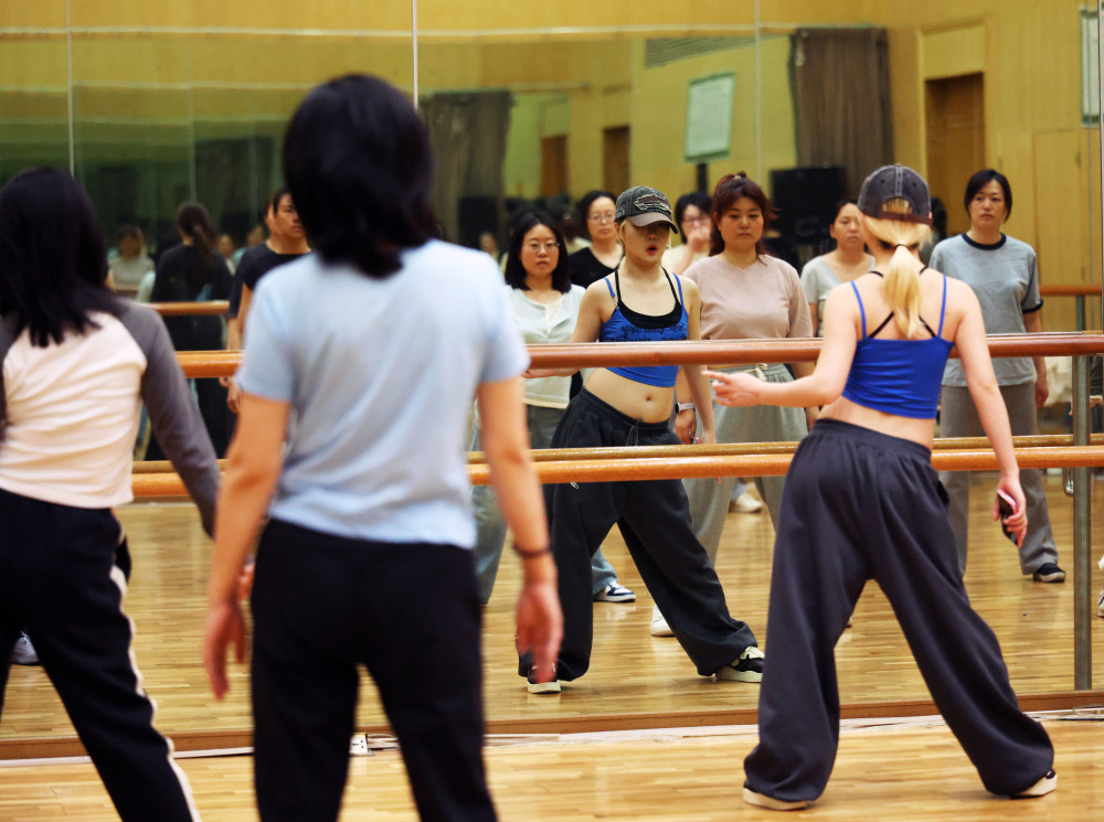 4月13日,在上海市群众艺术馆,“爵士舞基础班”的学员们在老师的指导下练习。新华社记者 刘颖 摄