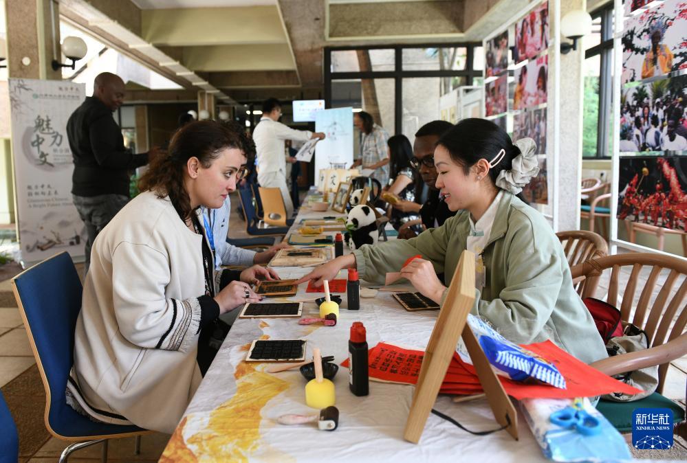 4月13日,在肯尼亚内罗毕,人们在联合国中文日文化体验活动现场体验书法拓印。 新华社记者 刘琼 摄