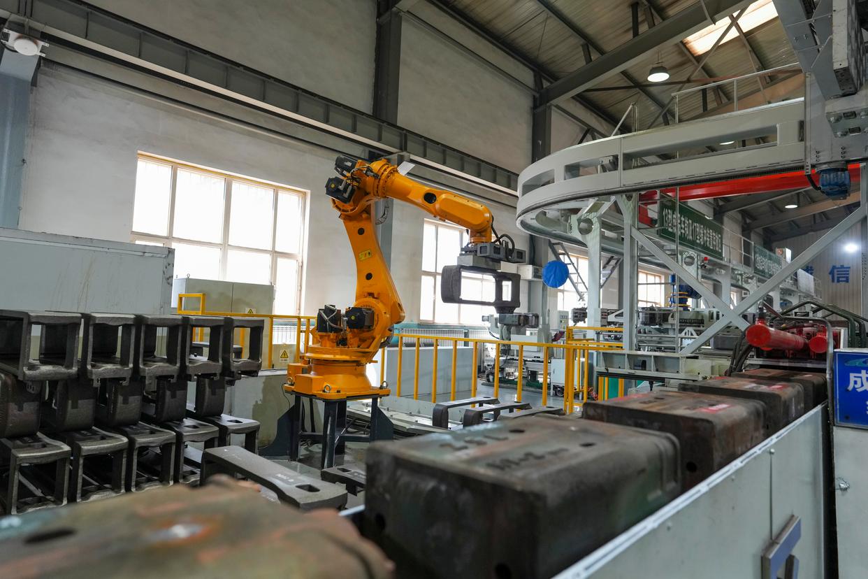 机器人在中国铁路哈尔滨局集团有限公司哈尔滨车辆段钩缓车间对火车车体组件进行维护保养作业(4月15日摄)。新华社记者 王松 摄