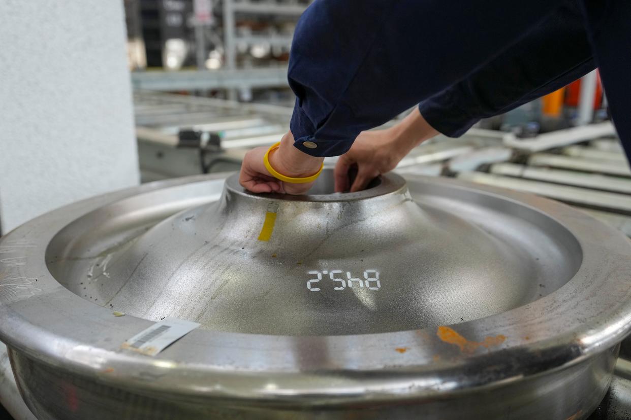 在中国铁路哈尔滨局集团有限公司哈尔滨车辆段轮轴车间,技术人员对检修后的火车轮轴开展抽检(4月15日摄)。新华社记者 王松 摄