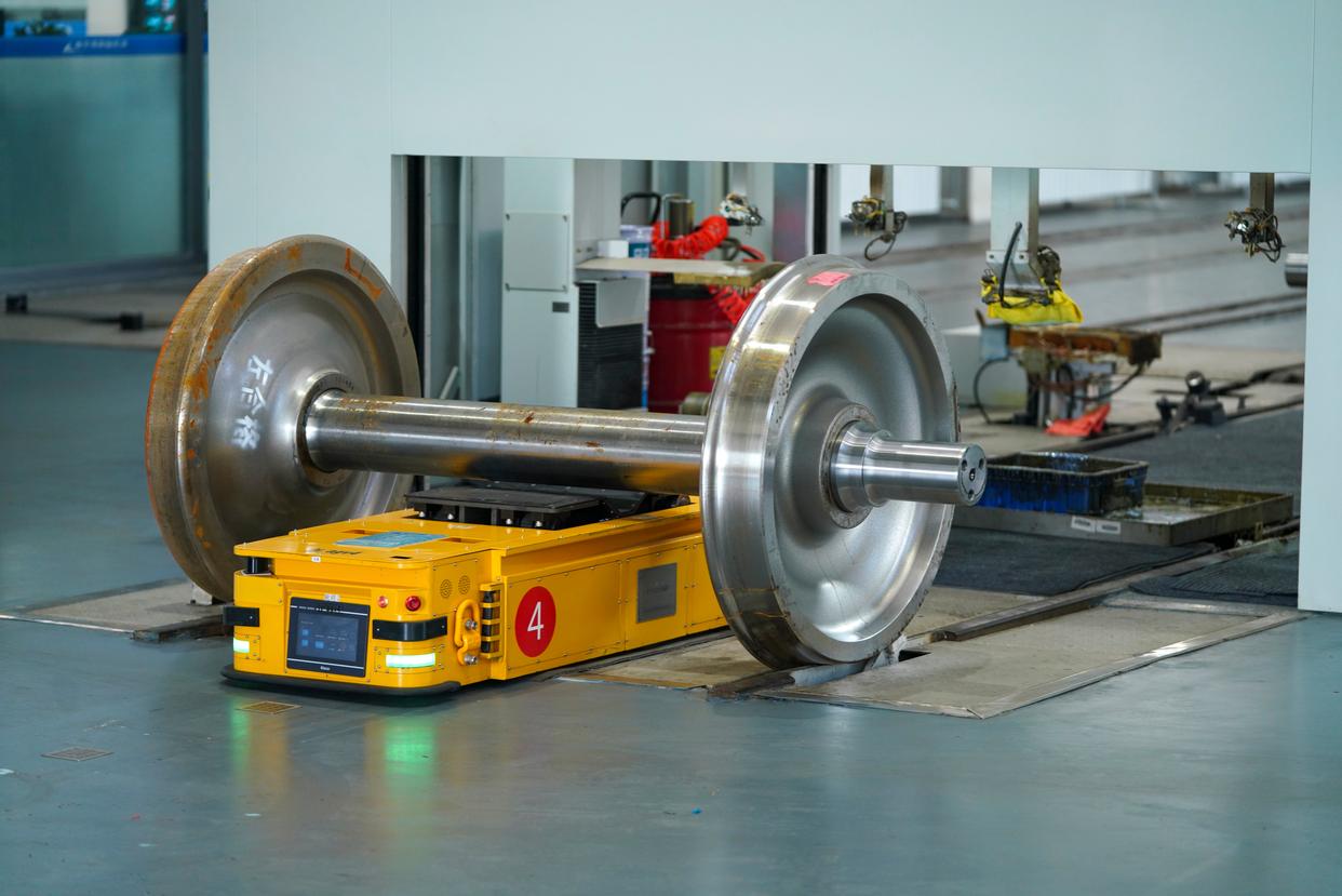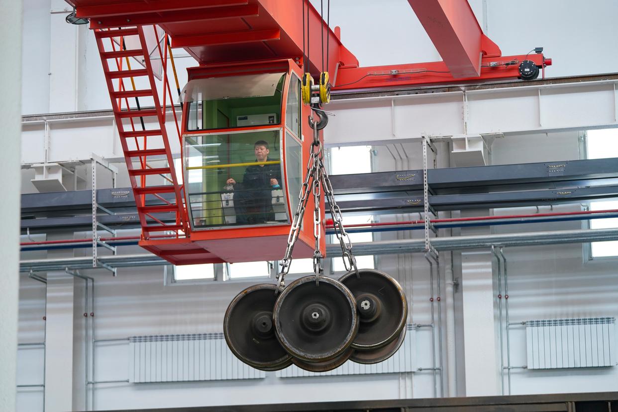 在中国铁路哈尔滨局集团有限公司哈尔滨车辆段轮轴车间,吊车在运送火车轮轴(4月15日摄)。新华社记者 王松 摄