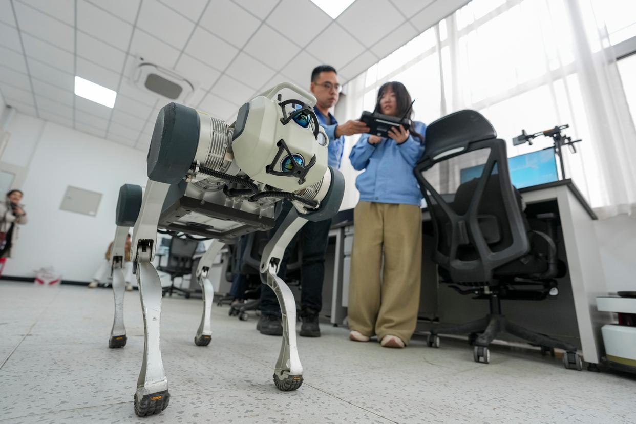 在哈尔滨国铁科技集团股份有限公司试验基地,技术人员对应用于铁路物流质量管控的机器狗进行安全性及可靠性评估测试(4月15日摄)。新华社记者 王松 摄