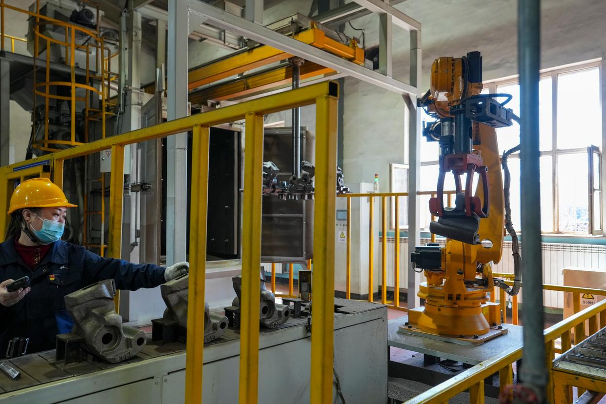 在中国铁路哈尔滨局集团有限公司哈尔滨车辆段轮轴车间,配备AI智能识别系统的全自动检修流水线对火车轮轴进行检修作业(4月15日摄)。新华社记者 王松 摄