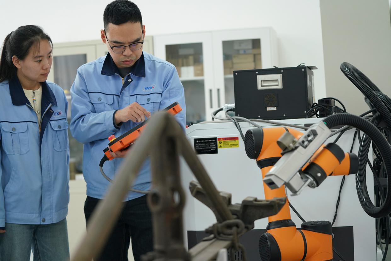 在哈尔滨国铁科技集团股份有限公司试验基地,技术人员对铁路列车检修机器人的性能进行安全性及可靠性评估测试(4月15日摄)。新华社记者 王松 摄