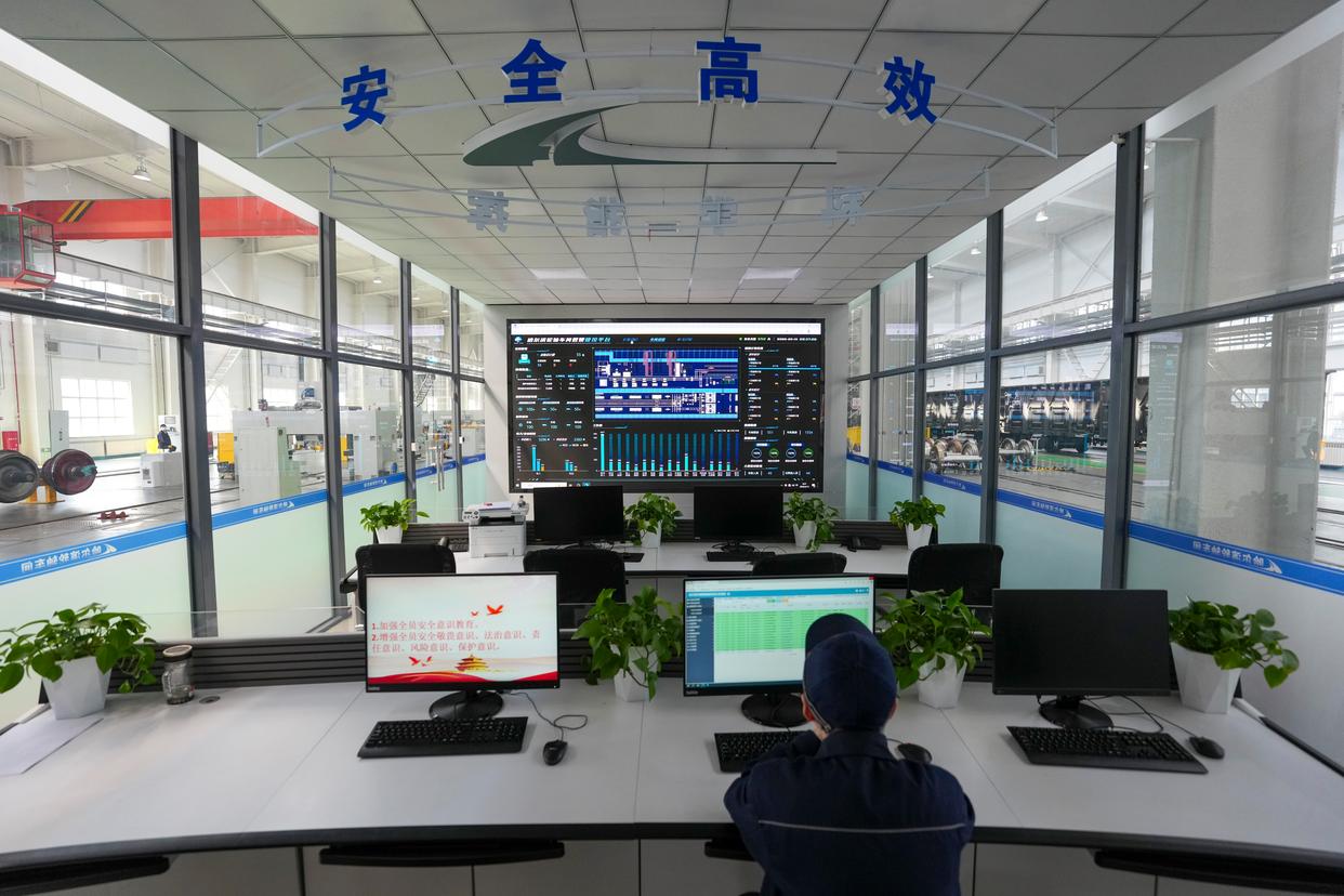 技术人员在中国铁路哈尔滨局集团有限公司哈尔滨车辆段轮轴车间数智管控平台监测设备运行参数(4月15日摄)。新华社记者 王松 摄