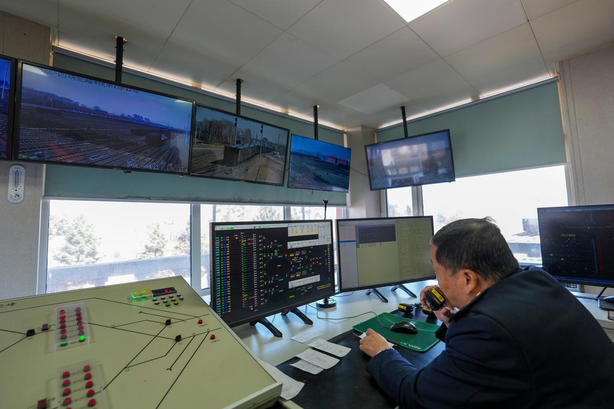 在哈尔滨南站编组车间,工作人员借助智能驼峰控制信息系统对货运列车开展编组作业(4月15日摄)。自该系统投用以来,哈尔滨南站整体编组效率提升了25%以上。新华社记者 王松 摄