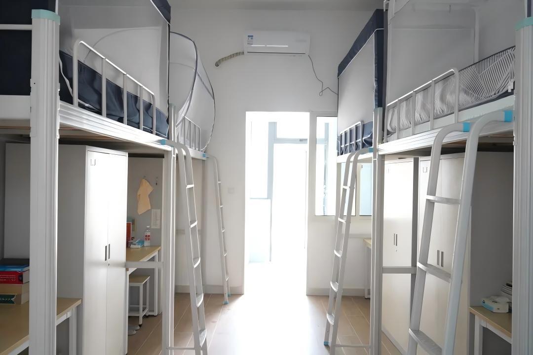 宿舍条件相当优越:房间宽敞明亮,有双洗手台、双卫生间,上床下桌,配有空调、热水。甚至阳台上的晾衣架,都由学校统一配备。宿舍楼每层楼至少配备1名生活老师。