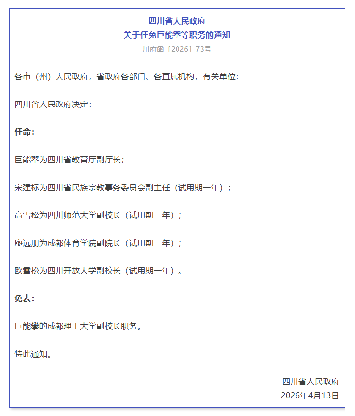 据成都日报,4月16日,四川省人民政府网站公布一批人事任免。具体如下: