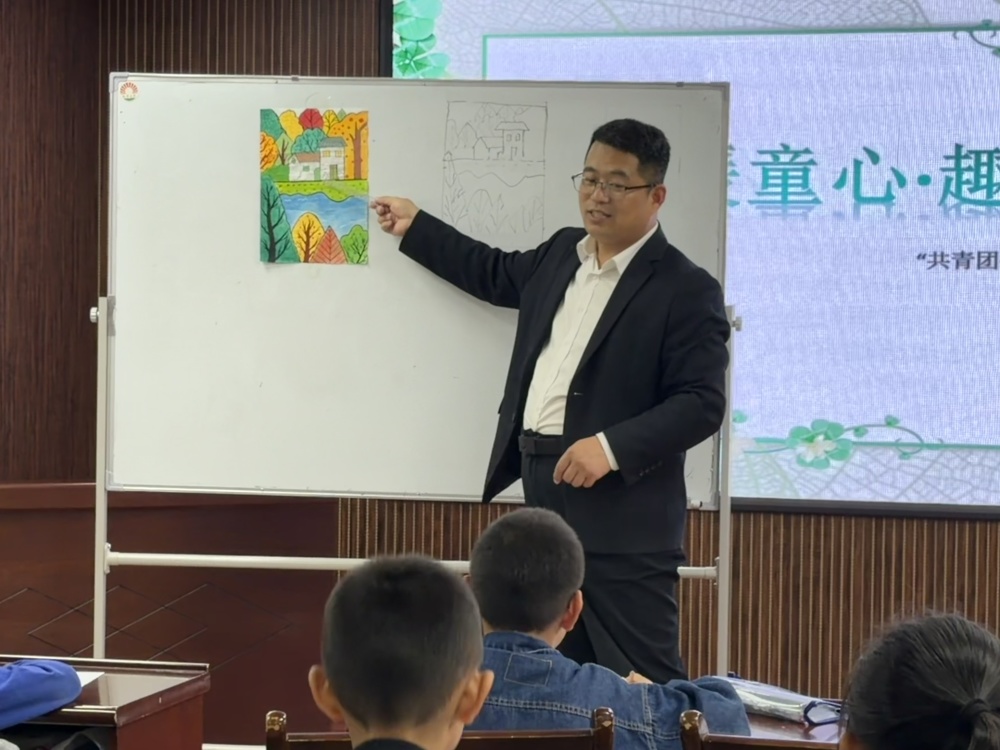 在乐陵市社会福利中心培训室,“共青团·伙伴计划”春假公益托管班如期举行。书画爱好者、乐陵市新的社会阶层服务中心主任王亮亮正带领学生们认识构图与色彩搭配。