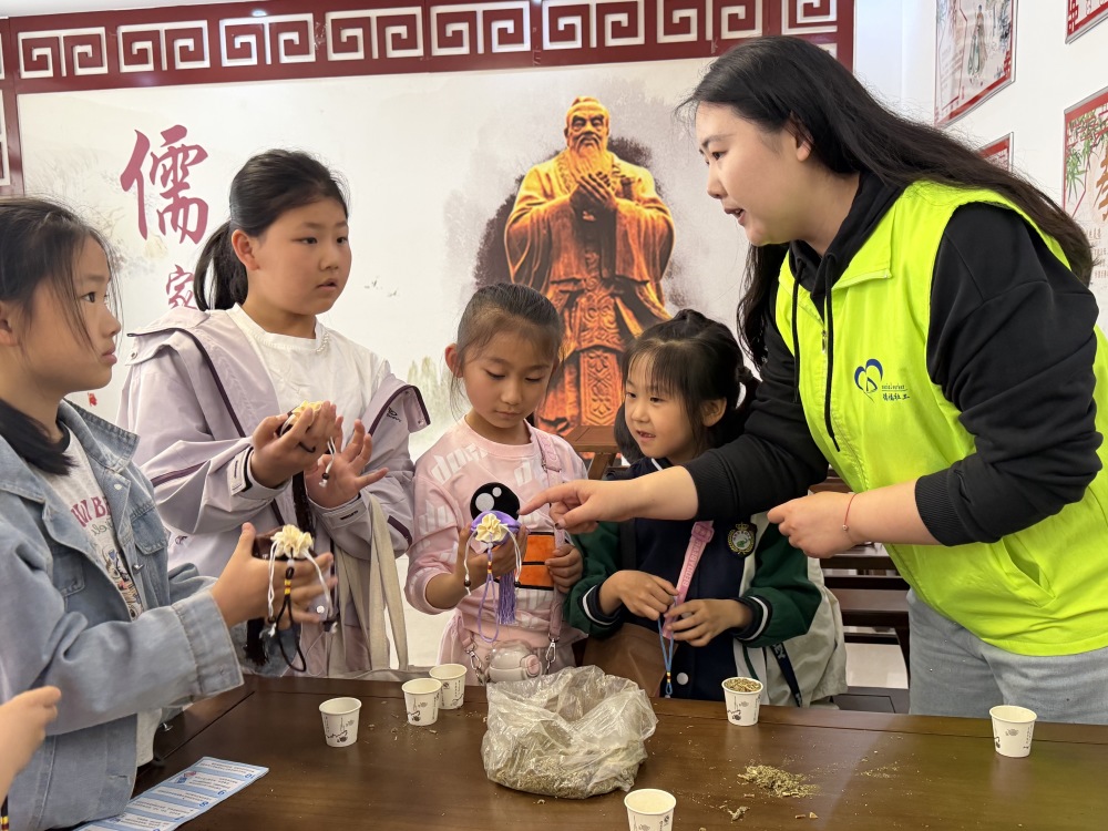 16日,乐陵市小学生在乐陵市市中街道安居社区内体验香囊制作。新华社记者 张力元 摄