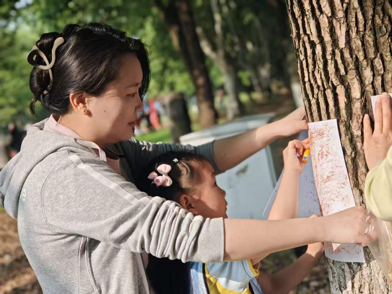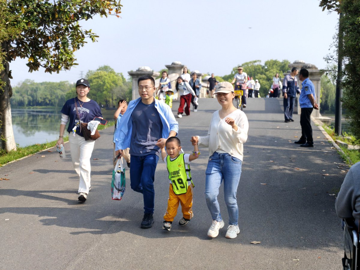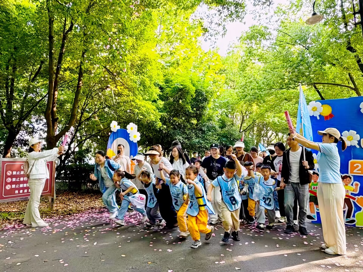 随着出发信号响起,萌娃与家长牵手并肩,正式开启奔跑。春日绿道之上,大手牵小手稳步前行,欢声笑语与湖光春色相映成趣。活动巧妙融入亲子趣味游戏与自然美工体验,孩子们通过钻爬跳跃挑战自我,用落叶、花瓣创作自然手作,让运动乐趣与自然之美有机交融,在沉浸式体验中感悟坚持、合作、拼搏的体育精神。